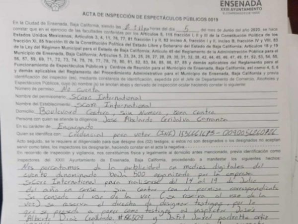 “Nos percatamos de la información en medios digitales del evento denominado Baja 500 organizado por la empresa Score International para realizarse del 14 al 19 de julio del año en curso sin contar con el permiso correspondiente”, indica el acta entregada por la Inspección de Espectáculos Públicos y revelada en redes sociales por el periodista Fernando Escobedo.