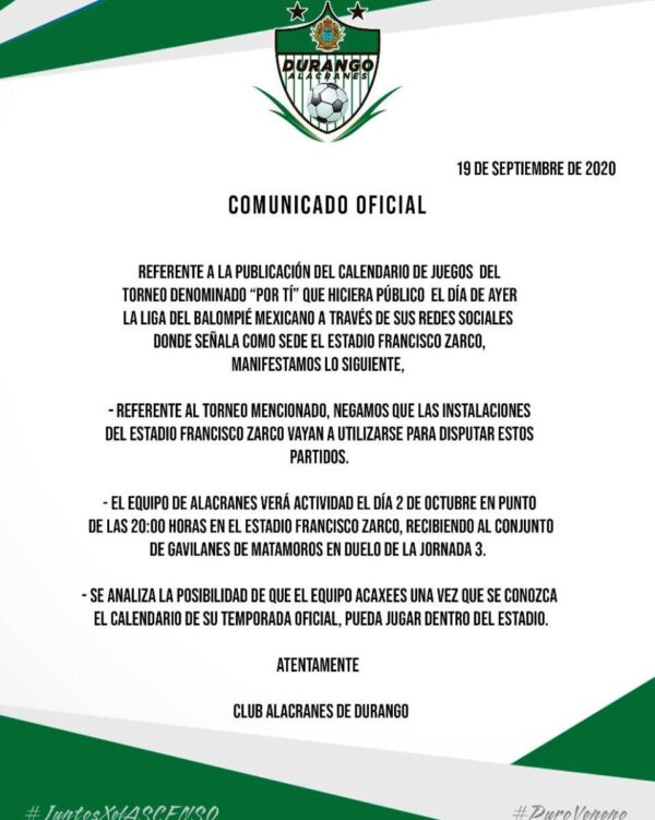 Ensenada, Baja California.- Los Alacranes de Durango desmintieron la publicación de la Liga de Balompié Mexicano en torno a que el torneo de pretemporada Por Ti se llevará a cabo en el Estadio Francisco Zarco de esa ciudad.