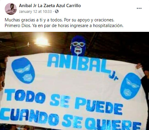 Días después, exactamente el 12 de enero, Aníbal Jr publicó un nuevo mensaje en su página de Facebook, en el que agradeció el apoyo de sus seguidores e informó que ingresaría a un hospital para ser tratado por coronavirus.